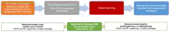 Schematic representation of the energetic costs and environmental impact of hyperbaric storage at uncontrolled room temperature compared to conventional refrigeration [99,100].