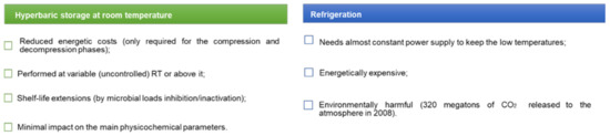 Consequently, this method has attracted the attention of many researchers during the last few years, and some studies have been made recently to assess the feasibility of this technology for food preservation compared to refrigeration [101]. HS/RT has been shown to inhibit microbial growth at 50–100 MPa, to inactivate microorganisms at higher pressures (100–220 MPa), and to attenuate some of the physicochemical changes that occur during storage at AP, thereby yielding similar or better products than those obtained with refrigerated storage. HS/RT requires energy only during the short compression and decompression phases, and no additional energy is required to maintain the product while stored under pressure for prolonged periods. Energy cost savings with HS/RT were 101investigated by [99], who concluded that energetic costs of HS/RT were lower than refrigerated storage (Figure 3). Additionally, the carbon footprint associated to HS/RT is also lower than refrigeration. With regard to refrigeration, the two main sources of CO2 production are from energy utilization and the leakage of cooling gas, while, for HS/RT, the CO2 produced by energy consumption is negligible, and the main source of CO2 emissions are attributable to the production of construction materials used for the hyperbaric chamber, thereby demonstrating that HS/RT generates considerably less CO2 than conventional refrigeration processes [99].