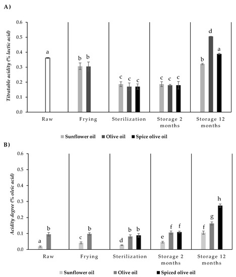 Titratable acidity (% lactic acid) of eels (A) and acidity degree (% oleic acid) of filling oils (B) throughout the different steps of the canning process (raw, after frying, and after sterilization process) and after 2 and 12 months of storage. Plotted values are mean of at least three determinations ± standard deviation. a–h Mean values with different letters are significantly different (p < 0.05).