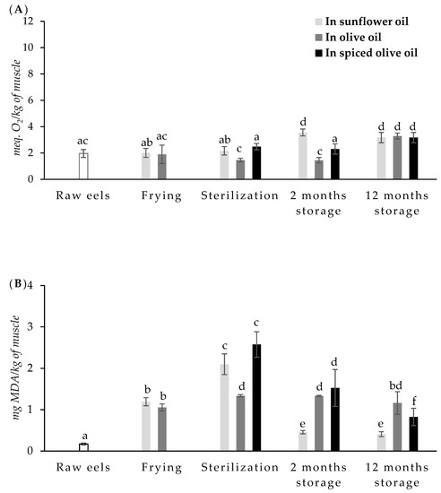 During the treatment of sterilization, TBARS values increased significantly. In this case, the increase was higher in canned eels packed in sunflower oil (2.10 mg MDA/kg) or in spiced olive oil (2.57 mg MDA/kg) than in canned eels packed in olive oil (1.34 mg MDA/kg). Selmi et al. [32] reported that cooking increased PV in sardine, but canning did not cause significant changes. In this same line, Uriarte-Montoya et al. [38] indicated that the canning did not have a significant effect on the oxidation in Pacific sardine (Sardinops sagax caerulea).
