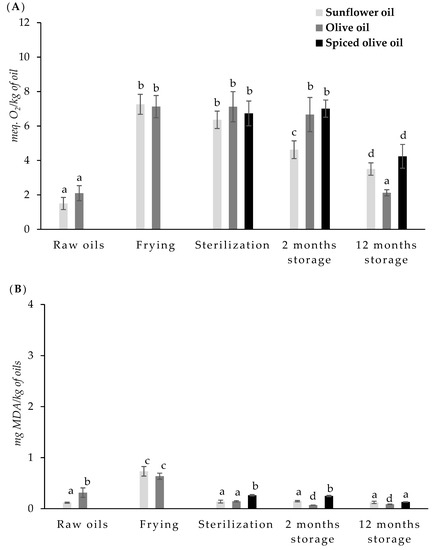Frying caused a significant increase in PV with respect to crude oils (7.26 and 7.13 meq. O2/kg of oil in sunflower and olive oils, respectively). However, the sterilization process did not cause significant changes in PVs of the oils.