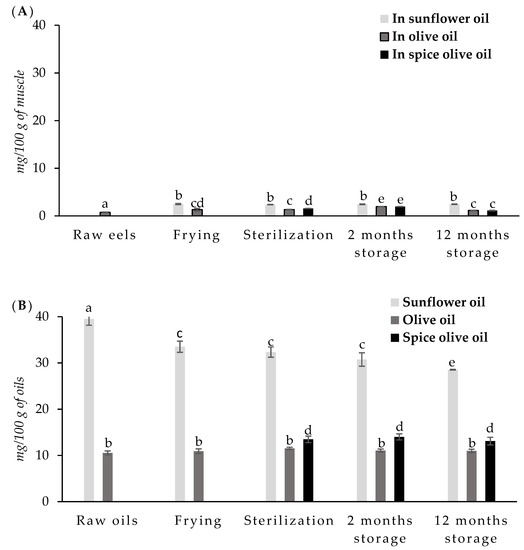 Sterilization process did not have a significant effect on the vitamin E content of fish, even though canned eels packed in spiced olive oil showed higher average values than the fried eels. Ersoy and Özeren [61] reported a significant increase in tocopherol content in African catfish after different treatments such as baking, grilling, microwaving, and frying. Merdzhanova et al. [60] also found a significant increase in tocopherol content after frying in Black Sea horse mackerel.