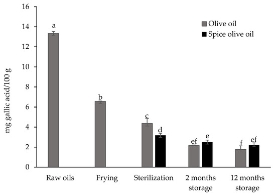 The frying and sterilization processes caused high losses of phenolic compounds. During sterilization, the highest losses occurred in spiced olive oil. These losses could be due to thermal oxidation reactions, hydrolysis, and polymerization, or to covalent linking between oxidized phenols and proteins or amino acids [25,72]. On the other hand, it has been pointed out that when vegetables are present during heating treatment, they also contribute to the leaching of substances that are released from disrupted cell walls and subcellular compartments [68].