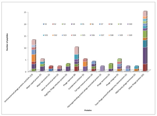 For strains S2 and S3, six and three phage peptides were determined, respectively. For strain S4, seventeen phage peptides were determined, and three phage peptides were determined for strain S5. For strains S6 and S7, three and one phage peptides were determined, respectively. Moreover, for strains S8 and S9, two phage peptides and seven phage peptides were determined. For strains S10 and S11, five and three phage peptides were determined, respectively. For strains S12 and S13, five phage peptides and six phage peptides were determined, respectively. For strains S14 and S15, four and two phage peptides were determined, respectively. For strain S16, three phage peptides were determined, and one phage peptide was determined for strain S17. For strains S18 and S19, one phage peptide each was determined. Finally, for strain S20, seven phage peptides were determined.