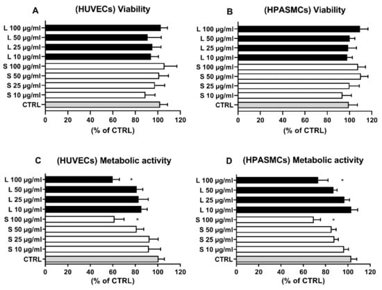 Effect of OMW on HUVECs and HPASMCs viability and metabolic activity. Cells were exposed for 24 h in the absence (CTRL) or presence to the indicated concentrations of OMW extracts. Cell viability (A,B) and metabolic activity (C,D) were assessed as reported in the materials and methods. HUVECs, human umbilical vein endothelial cell; HPASMCs, human pulmonary artery smooth muscle cells; L, liquid extract; S, solid extract; CTRL, untreated cells; * significantly different from CTRL; Values are shown as mean ± SD and expressed as a percentage of the CTRL. (n = 4).