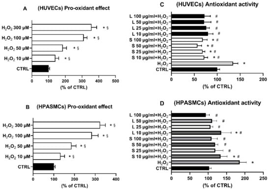 (A,B) Dose–response effect of H2O2 on intracellular ROS levels of HUVECs (A) and HPASMCs (B). Cells were exposed for 6 h to the indicated concentrations of H2O2. Intracellular ROS levels were assessed as reported in Materials and Methods. (C,D) OMW extracts counteract H2O2-induced ROS increase in both HUVECs (C) and HPASMCs (D). Cells were exposed for 3 h to the indicated concentrations of OMW extracts and then incubated for 6 h in the presence of 75 µM H2O2. Intracellular ROS levels were assessed, as reported in Materials and Methods. HUVECs, human umbilical vein endothelial cell; HPASMCs, human pulmonary artery smooth muscle cells; L, liquid extract; S, solid extract; CTRL, untreated cells; H2O2, hydrogen peroxide; * significantly different from CTRL; § significantly different from each other; # significantly different from H2O2. Values are shown as mean ± SD and expressed as a percentage of the CTRL. (n = 5).