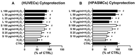 OMW extracts protect HUVECs (A) and HPASMCs (B) from H2O2-induced cell death. Cells were exposed for 3 h to the indicated concentrations of OMW extracts and then incubated in the absence (CTRL) or presence of 75 µM H2O2. Cell viability was assessed as reported in Materials and Methods. HUVECs, human umbilical vein endothelial cell; HPASMCs, human pulmonary artery smooth muscle cells; L, liquid extract; S, solid extract; CTRL, untreated cells; H2O2, hydrogen peroxide; * significantly different from CTRL; # significantly different from H2O2. Values are shown as mean ± SD and expressed as a percentage of the CTRL. (n = 4).