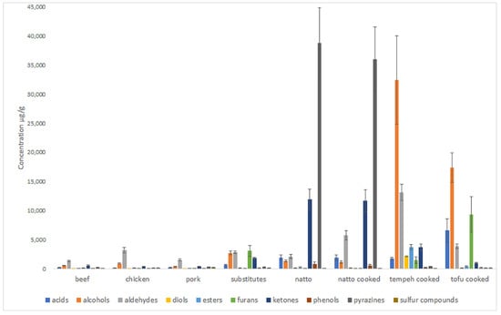 A total of 98 volatiles were identified across the meat, meat substitutes, and fermented plant food products using the SPME GC-MS method (Table S1). Obvious qualitative and quantitative differences between the volatile profiles of meat and plant-based products were observed (Figure 1). Overall, the traditional plant-based products (natto, tempeh, and tofu) had a higher concentration of total volatiles compared to meat and meat substitute products. The concentration of total volatiles in natto and tempeh was approximately 10 times higher than in the meat samples. The volatile profile of the natto was dominated by alkylpyrazines and ketones, whereas the tempeh was dominated by alcohols and aldehydes. The cooked tofu had a higher concentration of most volatile classes compared to meat, especially alcohols, furans, and organic acids (acetic acids). The concentration of volatiles in the meat substitutes was generally higher than in meat, with a relatively high concentration of alcohols (mainly ethanol), furans (mainly 2-pentylfuran), and ketones, mainly 2,3-butanedione (diacetyl) and 3-hydroxy-2-butanone (acetoin). It should be noted that no consideration of the odor quality or differences in odor activity of volatile compounds was considered in this study.