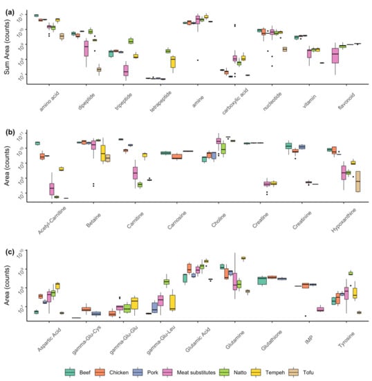 Non-volatile profile of meat, meat substitutes, natto, tempeh, and tofu. Box plots of: (a) All compounds from the major compound classes were summed, each sample was classified as either beef (green), chicken (orange), pork (blue), meat substitute (pink), natto (light green), tempeh (yellow), or tofu (beige); (b) the dominant amines in each sample group; (c) the dominant amino acids, di-, and tri-peptides; IMP is inosine 5′-monophosphate. Box plots show the median, 1st and 3rd quartiles, minimum and maximum values and the dots represent the outliers.