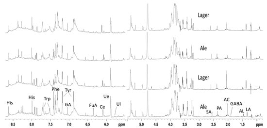 Representative 800 MHz 1H NMR spectra of ale and lager craft beers in phosphate buffer solution. LA, lactic acid; Al, alanine; GABA, gamma aminobutyric acid; AC acetate; PA, pyruvic acid; SA, succinic acid; Ul, uracil; Ue, uridine; Ce, cytidine; FuA, fumaric acid; Tyr, tyrosine; GA, gallic acid; Phe, phenylalanine; Trp, tryptophan; His, Histidine.