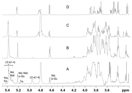 Shown are 800 MHz 1H NMR spectra of beer (A), mash (B), starch hydrolysis with α-amylase (C), and starch hydrolysis with amyloglucosidase (D).