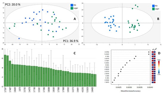 Principal component analysis (PCA) (A) and OPLS-DA scores plots (B) of ale and lager beers from 1D 1H NMR aligned using ICOSHIFT. Variable importance in projection (VIP) plot obtained by the OPLS-DA model showing the most significant variables for the classification (C) and variable importance plot obtained from random forest (D).