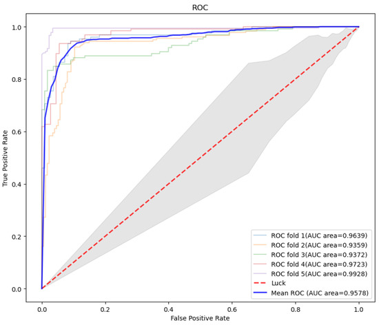 By connecting left-to-right and right-to-left texts, a pre-processed deep two-way expression model was designed. After parameter optimization, the key parameters of the model were set as attention_probs_dropout_prob: 0.0, hidden_act: gelu, hidden_dropout_prob: 0.0, hidden_size: 1024, initializer_range: 0.02, intermediate_size: 4096, max_position_embeddings: 40,000, num_attention_heads: 16, num_hidden_layers: 30, type_vocab_size: 2, and vocab_size: 30. It can be found that the accuracy of the deep model reached 0.9310 (±0.0145), the recall was 0.9419 (±0.0163), the precision was 0.9262 (±0.0203), and the F1 score was 0.9344 (±0.0141), which showed great generalization ability. Furthermore, the ROC curve of BERT and the corresponding AUC value are shown in Figure 5. Its AUC reached 0.9578, showing the outstanding performance of our proposed method.