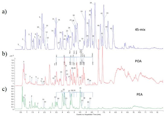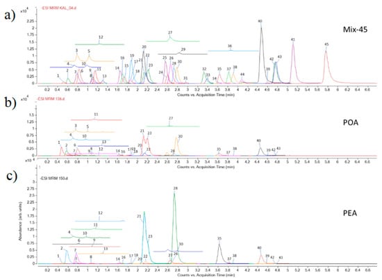 MRM chromatograms of standard compounds (3.125 μg/mL each standard), (a); of P. aviculare herb ethanol extract, POA, (b); and of P. amphibia herb ethanol extract, PEA, (c); 1: Quinic acid, 2: Gallic acid, 3: Protocatechuic acid, 4: Catechin, 5: 2,5-dihydroxybenzoic acid, 6: 5-O-caffeoylquinic acid, 7: Epigallocatechin gallate, 8: p-Hydroxybenzoic acid, 9: Esculetin, 10: Epicatechin, 11: Caffeic acid, 12: Vanillic acid, 13: Syringic acid, 14: p-Coumaric acid, 15: Umbelliferon, 16: Scopoletin, 17: Ferulic acid, 18: Sinapic acid, 19: Vitexin, 20: Luteolin-7-O-glucoside, 21: Quercetin-3-O-galactoside, 22: Rutin, 23: Quercetin-3-O-glucoside, 24: o-Coumaric acid, 25: Apiin, 26: Apigenin-7-O-glucoside, 27: Myricetin, 28: Quercetin-3-O-L-rhamnoside, 29: Secoisolariciresinol, 30: Kaempferol-3-O-glucoside, 31: 3,4-dimethoxycinnamic acid, 32: Baicalin, 33: Daidzein, 34: Matairesinol, 35: Quercetin, 36: Cinnamic acid, 37: Naringenin, 38: Luteolin, 39: Apigenin, 40: Kaempferol, 41: Baicalein, 42: Isorhamnetin, 43: Chrysoeriol, 44: Genistein, 45: Amentoflavone.