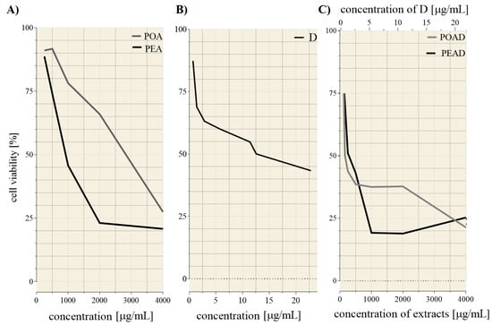 On the other hand, to overcome the problem of overall toxicity and resistance of cancer cells to chemotherapeutics, a combined approach that employs both commercial cytostatic and herbal extracts was subjected to the analysis. The benefit of this approach involves the induction of more diverse mechanisms of action that hinder the development of resistance and allow for the reduction of cytostatic doses. In this study, we examined in vitro cytotoxic properties of POA and PEA, alone and combined with commercial cytostatic D. Our investigation provided corroborative evidence that POA and PEA extract could potentiate D cytotoxicity in hepatocarcinoma (HepG2) cells. This result is in accordance with our previous findings [], which demonstrated a synergistic interaction between Polygonum maritimum extract and D in HepG2 cells. Likewise, Ghazali et al. [] demonstrated that herb extracts obtained from Polygonum minus have an antiproliferative effect on HepG2 cells. It has also been reported that the Polygonum cuspidatum extract has an antiproliferative effect on hepatocarcinoma cells Bel-7402 and Hepa 1–6 [], whereas extracts obtained from Polygonum glabrum and Polygonum orientale exhibited the protective activity on normal hepatocytes in vivo [,].