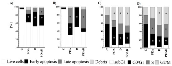 To determine whether the cytotoxicity of individual agents and their combinations is related to apoptosis and mediated by cell cycle arrest, the flow cytometry was applied. A significant increase in early apoptosis was determined after treatment with POA (21%). (Figure 3A,B). In addition, both concentrations of D, used for the preparation of combinations with POA and PEA, also increased early apoptosis of cancer cells (36% and 48.65%). An increase in both early and late apoptosis was observed when the PEA (29% and 38%, respectively) and POAD (26% and 17% respectively) were applied. However, in the case of PEAD co-treatment, only an increase in late apoptosis was detected (46.51%).