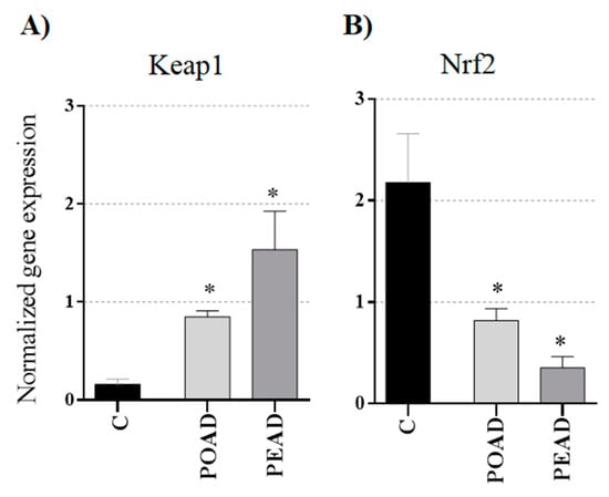 Beside the growth-inhibiting and apoptosis-inducing effects, phytochemicals are capable of modulating Nrf2 expression. Furthermore, due to the overexpression of Nrf2, malignant cells are frequently highly resistant to different chemotherapeutics [,]. Therefore, Nrf2 is an important pharmacological target of effective chemotherapy. This study demonstrated that both co-treatments decreased Nrf2 expression in HepG2 cells. As expected, this response was followed by increased Keap1 gene expression. Similar results were obtained for resveratrol, an active compound of Polygonum cuspidatum, which was shown to modulate Nrf2 expression in a concentration- and time-dependent way []. Comprehensively observed, Nrf2 has a functional link with numerous genes reported to play specific roles in the development of drug resistance. For instance, Nrf2 influences the regulation of phase II-detoxifying enzymes, antioxidant defense enzymes, and multidrug resistance-associated proteins 1-6 (MRP 1-6) [,]. Altogether, regulation of Nrf2 is responsible, at least partially, for chemotherapy resistance, indicating the importance of determining Nrf2 inhibitors, such as POAD and PEAD.