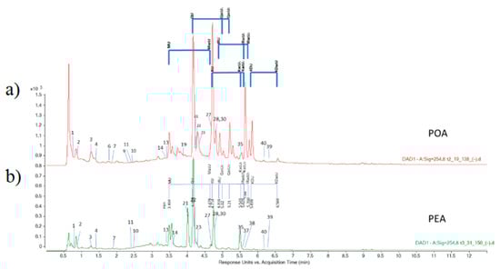 Polygonaceae species are rich sources of valuable secondary metabolites, mainly flavonoids. Data concerning chemical composition of P. aviculare is abundant, while P. amphibia has been less studied. Several studies gave important contributions in elucidating chemical composition of P. aviculare extracts [,,,,,,,,,,], but Granica et al. [,,], and Cai et al. [] stands out. Granica et al. [,] focused on developing new standardization HPLC methods for P. aviculare. Taking into account the results of Granica [], we have focused on a targeted search for given flavonol (myricetin (M), quercetin (Q), kaempferol (K), isorhamnetin (IR), kaempferide (KD)) glucuronides (U) and their acetylated derivatives (acU), as some of these tend to be the major compounds occurring in P. aviculare (Q-3-O-glucuronide or kaempherol-3-O-glucuronide). For HPLC separation conditions used in our work there is a pattern of elucidation order, as follows: MU, QU, MacU, KU, IRU, QacU1, QacU2, KacU1, IRacU1, KacU2, IRacU2, KDU, KDacU (Figure 5 and Figure 6) This way of analysis revealed significant differences between P. aviculare and P. amphibia plant extracts. Although both plant extracts contain myricetin-glucuronide and quercetin-glucuronide in significant amounts (not quantified), in PEA extracts the following compounds were not found: MacU, IRU, QacU1, QacU2, KacU1, IRacU1, KacU2, IRacU2, KDU, KDacU. Considering the scarce data on chemical composition of P. amphibia [,,,] this work, with quantitative and tentative qualitative HPLC analysis, creates a notable contribution.