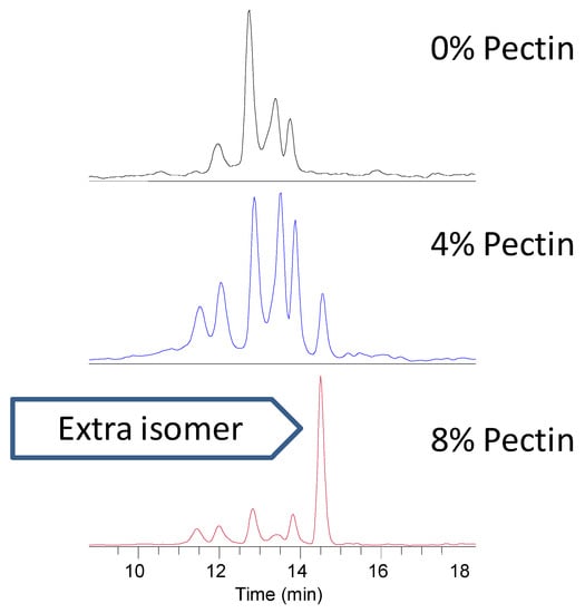 Parent catechins and flavonols were not detected in the urine obtained from rats fed the blackcurrant and green tea diets, but there were parent anthocyanins present. Catechin, anthocyanin and flavonol metabolites were present in the rat urine. Adding pectin to the blackcurrant and green tea diet affected the digestion and absorption of catechins, as shown by their presence or absence in the urine. The inclusion of soluble fiber in the diet may have promoted further metabolism via methylation, as shown by the additional methyl gallocatechin glucuronide isomer and variable isomer profiles with the addition of 4 and 8% pectin to the blackcurrant and green tea diets (Figure 1). In the feces, catechins were only present as the parent compounds, while for the anthocyanins, there were both parent compounds and metabolites. Catechin gallate and epicatechin were not found in the feces of rats fed blackcurrant and green tea with 8% pectin. Petunidin and peonidin rutinosides were only found in the feces of rats that consumed blackcurrant and green tea without pectin. Two phenolic acids (3, 4 and 2, 4-dihydroxybenzoic acid) were present in the feces and urine of rats fed blackcurrant and green tea diets with and without pectin, but absent in the blood plasma. In the plasma, we found no anthocyanin parent compounds or their metabolites in rats fed blackcurrant and green tea diets. The only catechin parent compound present in the plasma was catechin. Gallocatechin glucuronide was present in the plasma of rats fed a blackcurrant and green tea diet without pectin but was absent in rats fed the diets supplemented with 4 and 8% pectin. The only flavonol parent compound present in the plasma was quercetin rutinoside.