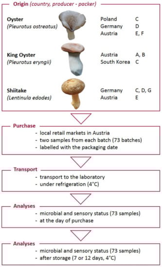The experimental program, comprising the main steps from the origin of cultivated mushroom samples, collection in retail markets, transportation and laboratory analyses, is illustrated in Figure 1. The pilot study primarily evaluated the microbial loads in association with the sensory quality of Austrian-grown and imported fresh cultivated mushrooms at the retail level and the effects of storage. The occurrence of foodborne pathogens in cultivated mushrooms at retail were studied. In single experimental approaches, the microbial status and the sensory quality of each batch were analysed at the day of purhase and after storage.
