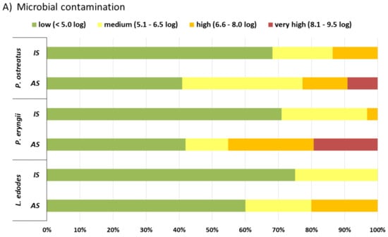 Microbial quality of mushrooms before (IS) and after storage was categorised according to the AMC load in five contamination levels: “low”, < 5.0 log cfu/g; “medium”, 5.1–6.5 log cfu/g; “high”, 6.6–8.0 log cfu/g; and “very high”, > 8.1 log cfu/g (according to our internal laboratory standard for fresh products).