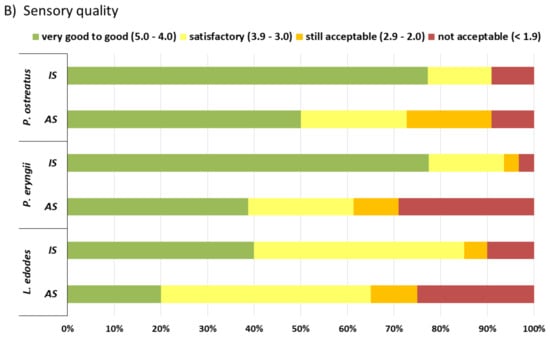 The maximum achievable score was five points, which meets the quality standard for edible fungi and fungus products according to Codex Alimentarius Standard [37]. The sensory quality of mushrooms (appearance, consistency and texture, aroma and taste) before and after storage was evaluated according to a grading system 1 to 5 (Supplementary Table S1): 5.0 to 4.0 “very good or good”; 3.9 to 3.0 “satisfactory”; 2.9 to 2.0 “still acceptable” and below 1.9 “not acceptable” and inadequate for human consumption [41].