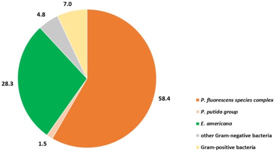 A total of 413 bacterial isolates were confirmed by partial 16S rRNA gene sequencing. An overview is given in Figure 3. The majority of isolates were accounted to Gram-negative bacteria (93.0%). In detail, 31.7% (n = 131/413) and 60.3% (n = 249/413) of the isolate set were Enterobacteriaceae and Pseudomonadaceae, respectively (Figure 3). The most abundant species complex was P. fluorescens (58.4% of isolates; n = 241/413). The P. fluorescens species complex isolates were assigned to following subgroups (SGs): P. fluorescens (48.5%; n = 117/241), P. gessardii (27.8%; n = 67/241), P. mandelii and P. koreensis (each 7.5%; n = 18/241), P. fragi (5.0%; n = 12/241), P. corrugata (2.5%; 6/241) and P. jessenii (1.2%; 3/241). In the P. fluorescens SG, P. azotoformans (40.2%; n = 47/117), P. tolaasii (21.4%; n = 25/117), P. canadensis (13.7%; n = 16/117) and P. trivialis (8.5%; n = 10/117) were the most abundant species. P. proteolytica (50.7%; n = 34/67) and P. brenneri (46.3%; n = 32/67) were the most often isolated members of the P. gessardii SG. The most abundant Enterobacteriaceae isolates were identified as E. americana (89.3%; n = 117/131) and Pantoea beijingensis (4.6%; n = 6/131). The Gram-positive bacteria (7.0%; n = 29/413) comprised mostly lactic acid bacteria (e.g., Lactobacillus sakei, Leuconostoc mesenteroides; 37.9%; n = 11/29) and aerobic spore formers (27.5%; n = 8/29). Details are provided in Supplementary Table S2.