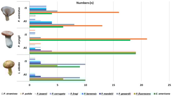 P. fluorescens SG and E. americana were predominantly isolated from king oyster mushrooms, which can be seen in Figure 4. The most abundant species or bacterial subgroups isolated from all sample types (n = 146) were P. fluorescens SG (54.7%; n = 80), E. americana (45.2%; n = 66), P. gessardii SG (26.0%; n = 38) and P. mandelii SG (8.9%; n = 13) (Figure 4). P. azotoformans (17.8%; n = 26), P. proteolytica (13.6%; n = 20), P. tolaasii (12.3%; n = 18) and P. brenneri (11.6%; n = 17) were the most observed Pseudomonas species detected in the samples.