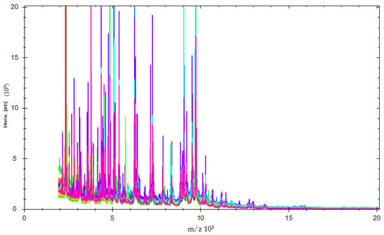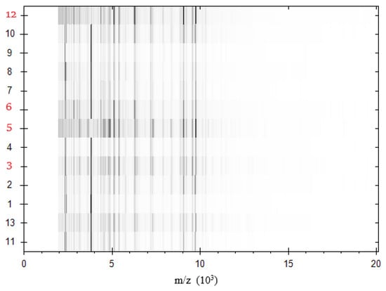 Characteristic spectra of MALDI-TOF MS. The variations in the mass spectrum of E. coli isolates are displayed by color.
