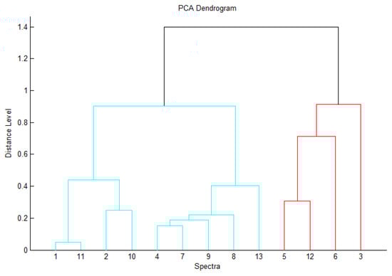 PCA-based dendrogram mass spectra of the tested E. coli isolates generated by MALDI-TOF MS. Non-related isolates are illustrated by red.