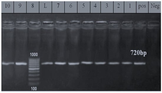 Agarose gel electrophoresis of phoA gene (720 bp). L: 100 bp ladder as molecular size DNA marker. Pos: Control positive for phoA gene. Neg: Control negative. Lanes from 1 to 10: Positive E. coli strains (O166, O146, O44, O111, and O26) isolated from beef shoulder and abattoir effluent for phoA gene.