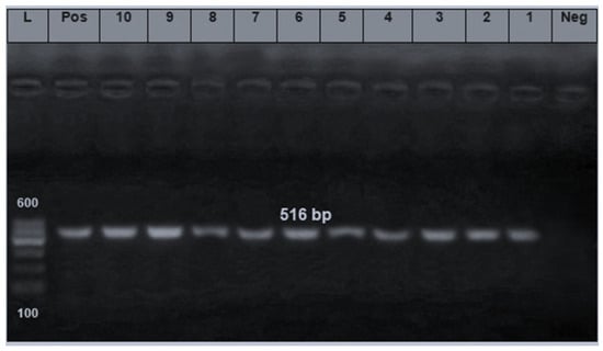 The PCR results of some representative isolates revealed that the blaTEM gene was detected at 516 bp in all examined E. coli isolates (Figure 6). Previously detected genes in E. coli were from, lamb meat (97.1%), meat products (69.2%,), and retail chicken 28.1% [,,,,].