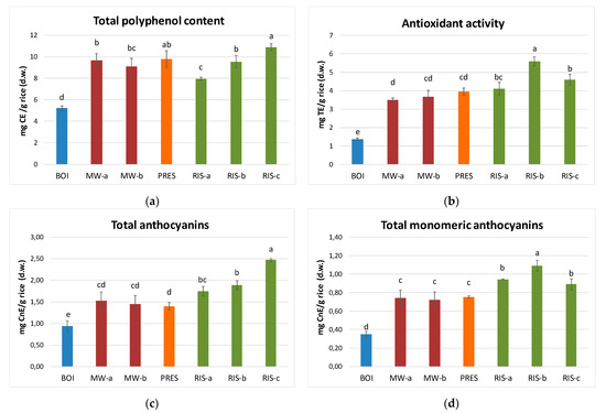 (a)Total phenolic content (mg CE/g d.w.), (b) total antioxidant activity (mg TE/g d.w.), (c) total anthocyanins (mg CnE/g d.w.), and (d) total monomeric anthocyanins (mg CnE/g d.w.) quantified in cooked black rice, expressed as mean ± standard deviation. For each parameter, values with different letters are significantly different (p < 0.05). CE: catechin equivalents; CnE: cyanidin-3-O-glucoside equivalents; TE: Trolox equivalents.