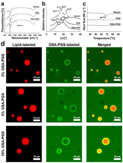 (a) Fourier transform infrared spectra, (b) X-ray diffractograms, and (c) heating calorigrams of maize starch, pregelatinized maize starch (PGS), and octenyl succinic anhydride-modified PGS (OSA-PGS). (d) Confocal laser scanning micrographs of emulsions stabilized by 3, 5, or 10% w/v OSA-PGS and oil volume fraction = 0.05 (Nile red, lipid-labeled; Concanavalin A conjugated with fluorescein isothiocyanate, OSA-PGS labeled).