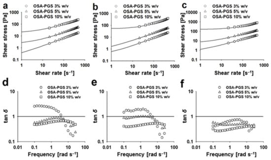 Flow behavior plots (shear stress vs. shear rate) of the emulsions stabilized by pregelatinized maize starch modified with octenyl succinic anhydride (OSA-PGS). Oil volume fraction: (a) 0.05, (b) 0.10, and (c) 0.20. Lines indicate the fitted curves based on the Herschel–Bulkley model (; , shear stress; , shear rate; , yield stress; , consistency index; , flow index). Loss tangent angles (; , loss modulus; , storage modulus) of the emulsions stabilized by OSA-PGS. Oil volume fraction: (d) 0.05, (e) 0.10, and (f) 0.20. Data were obtained by oscillation frequency sweep test. Lines indicate = 1.