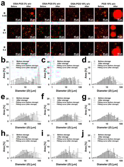 (a) Confocal laser scanning micrographs of emulsions stabilized by pregelatinized maize starch (PGS) or PGS modified with octenyl succinic anhydride (OSA-PGS) (Φ, oil volume fraction), before and after storage for 30 days. (b–j) Changes in the droplet diameter distribution of emulsions stabilized by OSA-PGS before and after storage for 30 days. OSA-PGS concentration: (b,e,g) 3, (c,f,i) 5, and (d,g,j) 10% w/v; oil volume fraction: (b–d) 0.05, (e–g) 0.10, and (h–j) 0.20. Data were obtained from confocal laser fluorescence micrographs of emulsions using image J image-processing software. Lines indicate the fitted curves based on the equation ; and , constants; , at the peak.