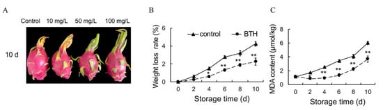 Senescence characteristics of pitaya fruit during storage at 25 °C. (A) Visual appearance of pitaya fruit treated with 0 (control), 10, 50 and 100 mg −1 BTH after 10 d of storage. (B,C) Effect of BTH treatment on weight loss rate (B) and malondialdehyde (MDA) content (C) in pitaya fruit during storage. The concentration of BTH was 50 mg−1. The data are presented as the mean ± SE of three replicates. Asterisks indicate the significant differences between the two groups (Student’s t test, * p < 0.05; ** p < 0.01).