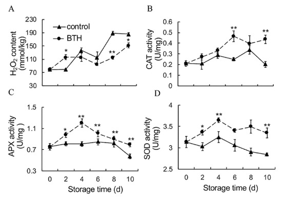 Effect of BTH treatment on H2O2 content (A), activities of CAT (B), APX (C) and SOD (D) in pitaya fruit during storage. H2O2, hydrogen peroxide; CAT, catalase; APX, ascorbate peroxidase; SOD, superoxide dismutase. Asterisks indicate the significant differences between the two groups (Student’s t test, * p < 0.05; ** p < 0.01).
