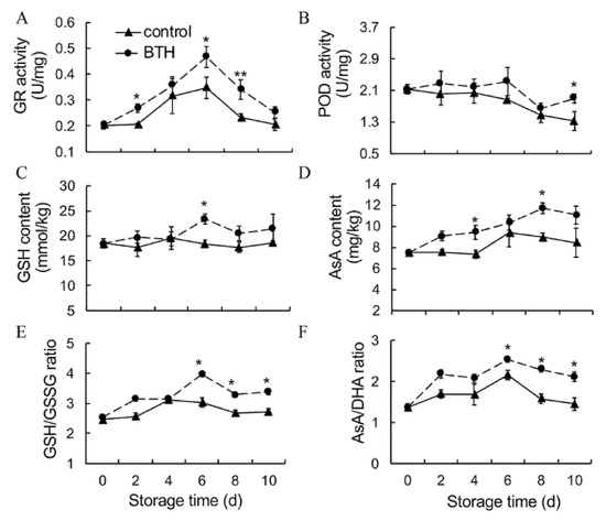 Effect of BTH treatment on activities of GR (A) and POD (B), contents of GSH (C) and AsA (D) and ratios of GSH/GSSG (E) and ASA/DHA (F) in pitaya fruit during storage. GR, glutathione reductase; POD, peroxidase; GSH, glutathione; AsA, ascorbic acid; GSSG, oxidized glutathione; DHA, oxidized ascorbic acid. Asterisks indicate the significant differences between the two groups (Student’s t test, * p < 0.05; ** p < 0.01).