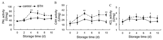 Effect of BTH treatment on activities of PAL (A), C4H (B) and 4CL (C) in pitaya fruit during storage. PAL, phenylalanine ammonia-lyase; C4H, cinnamate-4-hydroxylase; 4CL, 4-coumarate/coenzyme A ligase. Asterisks indicate the significant differences between the two groups (Student’s t test, * p < 0.05; ** p < 0.01).