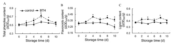 Effect of BTH treatment on contents of total phenolics (A), flavonoids (B) and lignin (C) in pitaya fruit during storage. Asterisks indicate the significant differences between the two groups (Student’s t test, * p < 0.05).