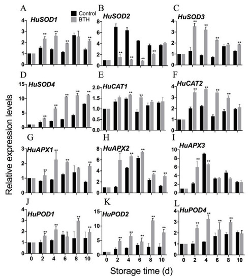 Expression levels of HuSODs (A–D), HuCATs (E–F), HuAPXs (G–I) and HuPODs (J–L) in pitaya fruit treated with or without BTH during storage. HuACT was used as the reference gene. Gene expression of the sample from 0 d was set as 1. Asterisks indicate the significant differences between the two groups (Student’s t test, ** p < 0.01).