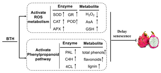 The phenylpropanoid pathway is considered as a rich source of secondary metabolites, such as phenolic compounds, flavonoids, coumarins and lignins in plants. In phenylpropanoid pathway, PAL, 4CL and C4H serve as the critical enzymes, of which PAL and C4H are the first and second rate-limiting enzymes [45,46], whereas 4CL is the key enzyme leading to the branch of phenylpropanoid pathway [26]. Phenols and flavonoids are the end products of phenylpropanoid pathway, and their accumulation are closely associated with plant resistance and senescence [47,48,49,50,51]. Lignin enhances the mechanical strength of plant cell walls and prevents microbial invasion [29], and is involved in regulation of senescence [52,53,54,55]. In the present study, application of BTH promoted PAL, 4CL and C4H activities (Figure 4), in consistence with the increased synthesis of phenols, flavonoids and lignin (Figure 5) in pitaya fruit. Li and colleagues also came to consistent results in red pitaya [1], who found that beta-aminobutyric acid treatment induces resistance against rot caused by Gilbertella persicaria via activating phenylpropanoid. It appears that the increased synthesis of phenols, flavonoids and lignin in BTH-treated pitaya fruit is important to maintain redox state and increase resistance, thereby delaying postharvest pitaya fruit senescence (Figure 7).