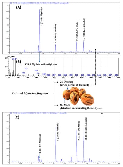 In the present study, 18 fatty acids were identified and quantified, utilizing GC-FID and GC-MS analyses (Table 2). The results, given in Table 2, show that oleic (C18:1n9) and linoleic acid (C18:2n6) are dominated in seed spices, and palmitic (C16:0), stearic, oleic, linoleic, and α-linolenic acid (C18:3n3) are the major constituents of herbs. An exception was myristic (C14:0) acid, which was 60.8% of total fatty acids in Myristica fragrans (nutmeg) seeds (Figure 1A,B). Surprisingly, myristic acid was just 1.59% of the total fatty acids in the M. fragrans (mace; Figure 1C) seed arils. The highest proportions of oleic acid (41.64–41.85%) were recorded in cardamon pods/capsules (Figure S1) and white pepper seeds (Table 2). The data of the fatty acid composition of cardamom pods and white pepper seeds are scarce. However, 40.6–49.2% of oleic acid has been reportedly extracted from cold-pressed cardamom seeds [17,18], which agrees with data obtained in the present study from whole cardamon pods.