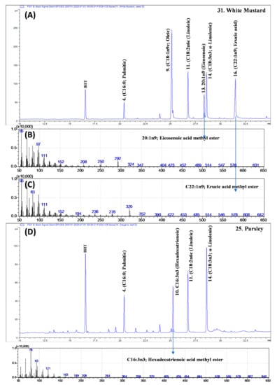 (A) The gas chromatography (GC)-flame ionization detection (FID) profiles of fatty acid methyl esters (FAMEs) of white mustard seeds. (B,C) The GC-mass spectrum of eicosenoic acid and erucic acid from white mustard seeds. (D) The GC-FID profiles of FAMEs of parsley leaves. The numbers, 4, 9, 10, 13, 14, and 16 correspond to peak numbers illustrated in Table 1. BHT: Butylated hydroxytoluene (A synthetic antioxidant used during lipid extraction).