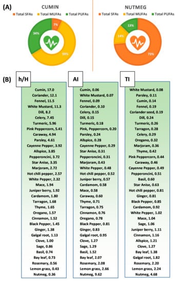 (A) Illustrations showing the high content of healthy monounsaturated (MUFAs) and polyunsaturated fatty acids (PUFAs) in cumin, compared to low contents of MUFAs and PUFAs, and high contents of saturated fatty acids (SFAs) in nutmeg. (B) Arrangements of studied spices and herbs in ascending/descending order according to the fat quality indices of the ratio of hypocholesterolemic (h)/hypercholesterolemic fatty acids, atherogenic index (AI), and thrombogenic index (TI).
