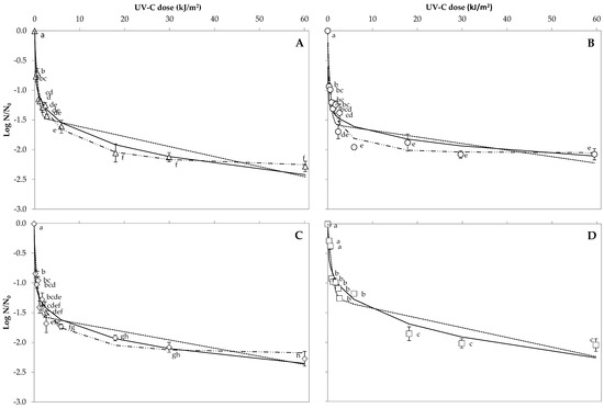 The Log-linear regression, a model typically used to assess the effect of a wide array of processing factors on microbial inactivation, including UV 254 nm treatment, is described by Equation (2) [36]: