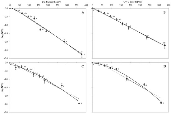 Survival curve of A. acidoterrestris CECT 7094T (A), A. acidoterrestris TA-1.183 (B), B. cereus (C) and B. coagulans (D) spores in orange juice at evaluated UV-C at 254 nm doses. The dots mean experimental data (black dots), and the lines represent fitted data predicted values, according to the Log-linear model (dashed line) and the Weibull model (solid line). Different letters indicate significant differences among spore reductions at different UV-C exposition doses according to the student’s t-test (p < 0.05).