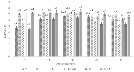 Initial Enterobacteriaceae counts ranged between 4.09 and 3.82 log CFU g−1 in all analyzed cases (Table 1). However, the number of Enterobacteriaceae always significantly decreased (p ≤ 0.05) throughout the ripening and were below the detection limit at the end of the maturation process.