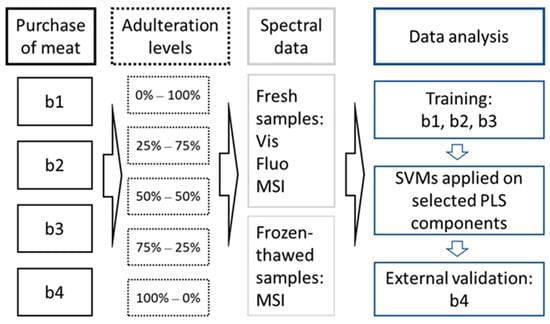 The models were developed using three independent batches (b1, b2, b3) and validated with an external batch (b4) so that a 75–25% proportion of the whole dataset was used for training-testing (external validation). The developed models were based on the algorithm of the support vector machines (SVMs), which is referred to as one of the most popular algorithms for meat species identification by Kumar and Karne [15]. The X-variables were transformed using the partial least-squares (PLS) algorithm [31,32] prior to the development of the classification models. PLS is a method for relating two data matrices (X, Y) and can be employed for dimensionality reduction and extraction. Downstream in the analysis pipeline, the number of PLS components explaining more than 96% of the input data variance and less than three components were used. In the case that more than three components were needed to explain 96% of the variance, only three components were used. Subsequently, the algorithm of the SVMs was applied on the transformed and redundant variables [33,34]. Intuitively, the algorithm of the SVMs maps the original data to a high-dimensional feature space using a kernel function so that a maximal separating hyperplane can be constructed. SVMs with a radial basis function (RBF) kernel were employed in the present study. A grid search in tandem with a 10-fold cross validation was performed to the training set for tuning the parameters of cost and gamma. The experimental setup and applied data analysis are shown in Figure 2.